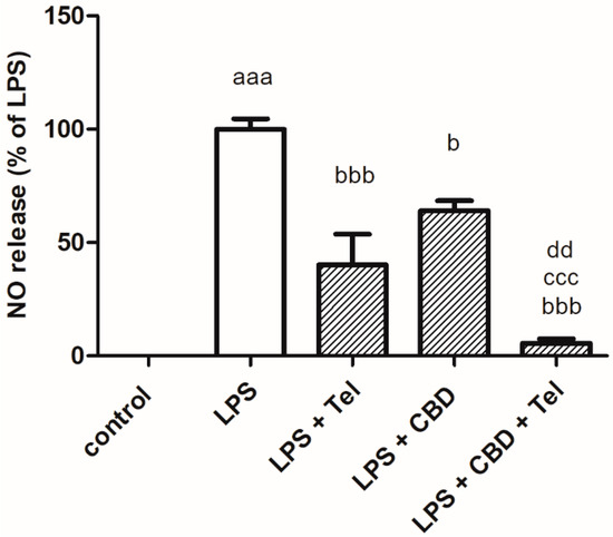 Telmisartan and CBD additively decreased NO production in LPS-stimulated BV2 microglia. BV2 microglia were incubated with LPS (7 ng/mL), LPS + telmisartan 5 μM, LPS + CBD 5 μM or LPS + CBD 5 μM + telmisartan 5 μM for 24 h. NO levels were determined in the media and normalized to the cell number. Three independent experiments were performed, n = 12; aaa p < 0.001 vs. control (non-stimulated cells); bbb p < 0.001 vs. LPS; b p < 0.05 vs. LPS; ccc p < 0.001 vs. LPS + telmisartan 5 μM; dd p < 0.01 vs. LPS + CBD 5 μM.