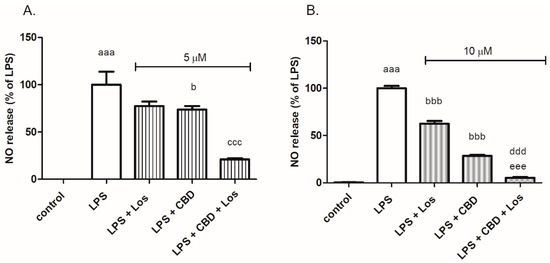 A synergistic inhibitory effect on NO production was also observed when cells were co-treated with losartan (10 μM) and CBD (5 μM) (decreased NO production by 80%) compared to cells exposed to each compound alone (by 22% and 26%, respectively) (Figure 2A). Co-treatment with increased concentrations of CBD (10 μM) produced an additive effect on LPS (7 ng/mL)-induced NO release (Figure 2B).