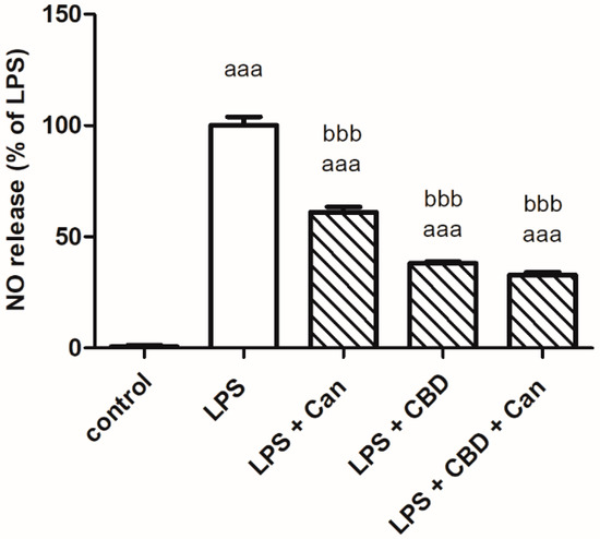 Candesartan and CBD given alone or together similarly decreased NO production in LPS-stimulated BV2 microglia. BV2 microglial cells were incubated with LPS 7 ng/mL, LPS 7 ng/mL + candesartan 5 μM, LPS 7 ng/mL + CBD 5 μM and LPS 7 ng/mL + CBD 5 μM + candesartan 5 μM for 24 h. NO levels were determined in the media and normalized to the cell number. Two independent experiments were performed, n = 8. aaa p < 0.001 vs. control (non-stimulated cells); bbb p < 0.001 vs. LPS.