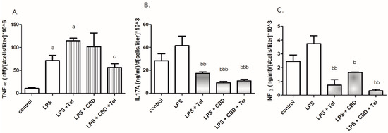 In contrast, telmisartan but not CBD significantly increased (by 60%) LPS-induced TNFα release. Both telmisartan and CBD significantly reduced (by 22%) TNFα release (Figure 4A). A greater effect of CBD with or without telmisartan was shown relative to telmisartan regarding the attenuation of the LPS-induced interleukin 17A (IL17A) release (by 80%, 74%, and 60%, respectively) (Figure 4B). Greater inhibition of interferon γ (IFNγ) release in LPS-treated cells was observed in the presence of telmisartan with or without CBD (by 80% and 92%, respectively). CBD alone inhibited IFNγ release by 60% (Figure 4C).