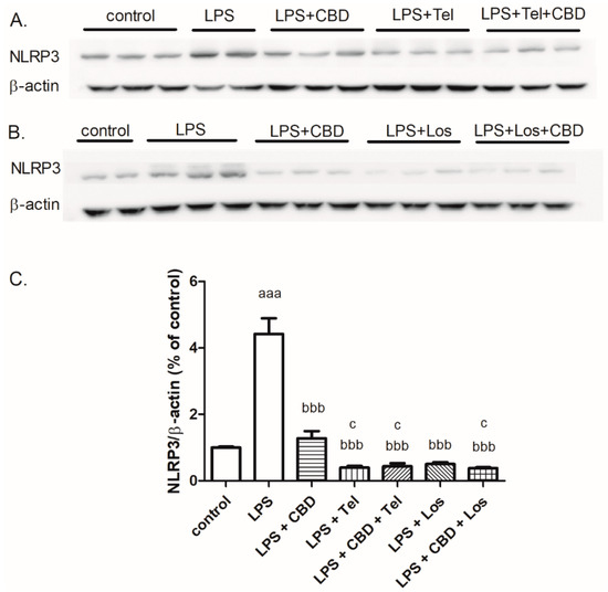 ARBs (telmisartan or losartan) and CBD, together or alone, decreased NLRP3 expression in LPS-induced BV2 microglia. BV2 microglial cells were incubated with LPS 7 ng/mL alone or together with CBD 5 μM or ARB (telmisartan 5 μM (A) or losartan 5 μM (B)) or both compounds for 24 h. Proteins from the cell lysate were loaded on 7.5% polyacrylamide-SDS gels. (C) An analysis of NLRP3 was performed using specific antibodies for it and β-actin. n = 6, two independent experiments were performed. aaa p < 0.001 vs. control (non-stimulated cells); bbb p <0.001 vs. LPS; c p < 0.05 vs. LPS + CBD 5 μM.