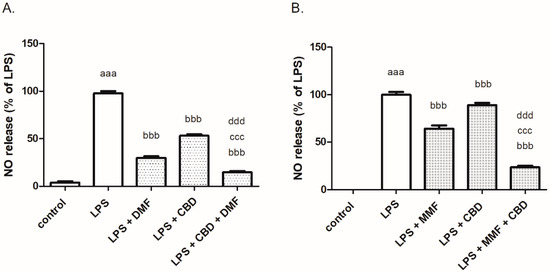 DMF (5 μM) and CBD (5 μM) reduced NO release in BV2 cells by 71% and 47%, respectively, and co-treatment with both drugs resulted in the 86% inhibition of NO release (Figure 6A). MMF, the primary metabolite of DMF, and CBD synergistically decreased LPS-induced NO synthesis (by 78%) compared to the inhibitory effect of each compound alone (by 35% and 15%, respectively) (Figure 6B).