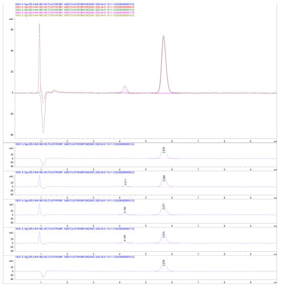 Chromatograms of tulathromycin in innovator drug (Draxxin), and generic drugs (Tulaject, Tulazen, Tulshot, and T-raxxin) by HPLC.