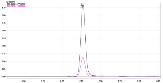 Mass chromatogram of Tulathromycin (precursor and daughter ion) in blood sample of cattle.
