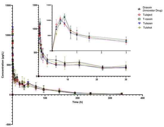 The 90% confidence interval in the average AUC and Cmax values among the standard drug (Draxxin injection) and generic products (Tulaject injection, Tulazen injection, Tulshot injection, and T-raxxin injection) are completely within the acceptable bioequivalence range of 80–120% as set by the FDA and European Medicines Evaluation Agency []. The results of our study confirm that Draxxin injection is bioequivalent to Tulaject, Tulazen, Tulshot, and T-raxxin injections and can be safely used interchangeably.