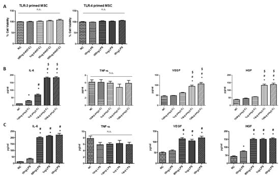 Dose-dependent effect of poly(I:C) and LPS on viability of hUCB-MSCs and their secretion of cytokines and growth factors. (A) Viability of hUCB-MSCs upon stimulation with increasing doses of poly(I:C) and LPS. (B) Measured IL-6, TNF-a, VEGF, and HGF levels in response to stimulation with increasing doses of poly(I:C) (n = 6 in all groups. *; p < 0.05 compared to NC. #; p < 0.05 compared to 100 ng. $; p < 0.05 compared to 1 μg). (C) Measured IL-6, TNF-a, VEGF, and HGF levels in response to stimulation with increasing doses of LPS (n = 6 in all groups. *; p < 0.05 compared to NC. #; p < 0.05 compared to 10 ng). NC: Normal Control. n.s.: not statistically significant. Data are shown as mean ± SEM. One-way ANOVA with Tukey’s post hoc test.