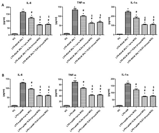 LPS stimulation significantly increased the levels of pro-inflammatory cytokines IL-6, TNF-a, and IL-1a compared to the NC group in RAW264.7 cells, a mouse alveolar macrophage cell line (Figure 2A). LPS-induced RAW264.7 cells were either untreated or treated with naïve MSCs, TLR3-primed MSCs, or TLR4-primed MSCs. The naïve MSC-treated group showed a significant reduction in inflammatory cytokine levels of IL-6, TNF-a, and IL-1a compared to the NC group. However, further significant reductions in these inflammatory cytokine levels were observed in the TLR3- and TLR-4-primed MSCs compared to those in the naïve MSC-treated group. No significant difference was observed in IL-6, TNF-a, and IL-1a levels between TLR3- and TLR4-primed MSC-treated groups. Consistent results were obtained in an LPS-induced primary cultured rat alveolar macrophage (AM) model, as an ex vivo approach (Figure 2B). After the LPS induction, rat AM secreted significantly higher IL-6, TNF-a, and IL-1a levels compared to the NC group. The increase in inflammatory cytokine levels was significantly reduced after treatment with naive MSCs. However, after treatment with TLR3- and TLR4-primed MSCs, inflammatory cytokine levels were further reduced compared to those after naïve MSC treatment. Inflammatory cytokine levels were not significantly different between the TLR3- and TLR4-primed MSC-treated groups in the LPS-induced rat AM model.