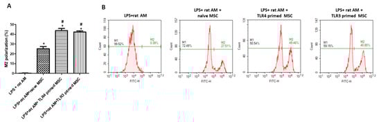The effect of MSCs on macrophage polarization in LPS-induced rat AM is shown in Figure 3. The extent of M2 polarization after LPS induction and treatment with naïve, TLR3-, and TLR4-primed MSCs was measured by FACS. The extent of M2 polarization in LPS-induced rat AM was only approximately 0.39%. When treated with naïve MSCs, the percentage of M2 phenotype increased significantly to approximately 27.51%. In the TLR3- and TLR4-primed MSC-treated groups, the M2 percentage significantly increased to 49.46% and 40.85%, respectively, compared to that in the naïve MSC-treated group. This suggests that TLR3- and TLR4-priming enhances the anti-inflammatory effect of MSCs against LPS-induced inflammation by modulating the macrophage phenotype.