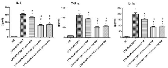 Compared to the NC group, LPS-induced RAW 264.7 cells showed significantly increased levels of proinflammatory cytokines IL-6, TNF-a, and IL-1a. The LPS-induced increase in proinflammatory cytokine levels was significantly reduced after treatment with naïve MSC-CM. However, the effect of MSC-CM on reducing the inflammatory cytokine levels was significantly greater in TLR3 and TLR4-primed MSC-CM compared to naïve MSC-CM. Next, to investigate whether the EVs were responsible for the effects of CM, Es and EV-removed CMs from each MSC were independently treated with LPS-induced rat AM (Figure 5).