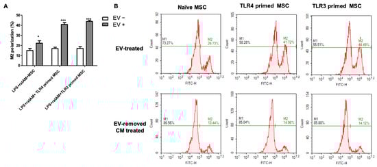 Percent representation of M2 polarization in LPS-induced rat AM after the treatment with MSC-derived EVs. (A) Bar graph and (B) FACS histogram representing the extent of M2 polarization in rat AM after treatment with isolated EVs or EV-removed CM from naïve, TLR3-, and TLR4-primed hUCB-MSCs. Rat AM: primary cultured rat alveolar macrophages (n = 4 in all groups. *; p < 0.05 ***; p < 0.0001 vs. EV-removed CM treated group). Data are shown as mean ± SEM. Two-way ANOVA with Bonferroni post hoc test.