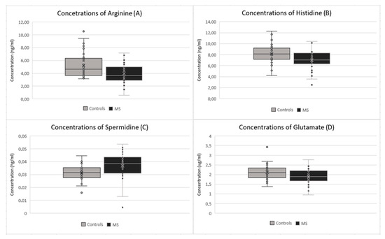 Comparison of concentrations between patients after the first clinical symptoms of MS and the control group in (A) arginine; (B) histidine; (C) spermidine; (D) glutamate.