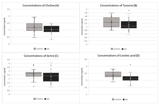 Comparison of concentrations between patients after the first clinical symptoms of MS and the control group in cases of (A) choline; (B) tyrosine; (C) serine; (D) linoleic acid.