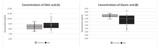Comparison of concentrations between patients after the first clinical symptoms of MS and the control group in (A) oleic acid; (B) stearic acid.