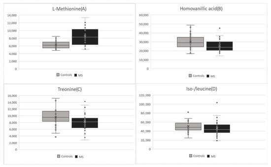 In other cases, we could not establish precise concentrations but, nevertheless, the next two metabolites were still significantly changed in patients after the first clinical symptoms of MS in comparison to the control group. For methionine (p-value: <0.001), we observed increased levels in the MS group (average of 8504.86) in comparison to the control group (average of 6256.72) (Figure 4A). For homovanillic acid (p-value: 0.023), we observed decreased levels in the MS group (average of 25,611.18) in comparison to the control group (average of 29,774.24) (Figure 4B). Differences in levels of other amino acids like threonine (p-value: 0.053, Figure 4C), leucine/isoleucine (p-value: 0.223, Figure 4D), alanine (p-value: 0.262) or aspartate (p-value: 0.541) were not statistically significant in the MS group in comparison to the control group. In comparison to results from our pilot study [21], we did not find any significant changes in palmitic acid (p-value: 0.711) here.
