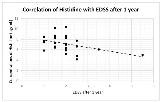 In histidine, we did not find any significant correlation between its concentrations and EDSS values at the time of CSF collection (r: 0.05; p-value: 0.74). One year after the CSF collection, we observed a statistically significant medium–strong negative correlation with histidine (r: −0.42; p-value: 0.03) (Figure 5). In EDSS values 2 years after, we also observed a statistically significant medium–strong negative correlation with histidine (r: −0.43; p-value: 0.048).