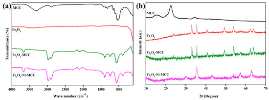 (a) FT-IR and (b) XRD of the MCC, Fe2O3, Fe2O3-MCC, and Fe2O3-Ni-MCC.
