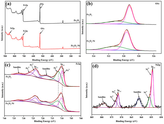 XPS analysis of the Fe2O3 and Fe2O3-Ni electrocatalysts. (a) Survey spectra and deconvoluted spectra of (b) O1s, (c) Fe2p, and (d) Ni2p for the electrocatalysts.