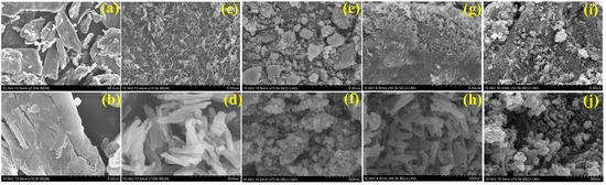 Scanning electron microscope images of (a,b) MCC, (c,d) Fe2O3, (e,f) Fe2O3-Ni, (g,h) Fe2O3-MCC, and (i,j) Fe2O3-Ni-MCC.