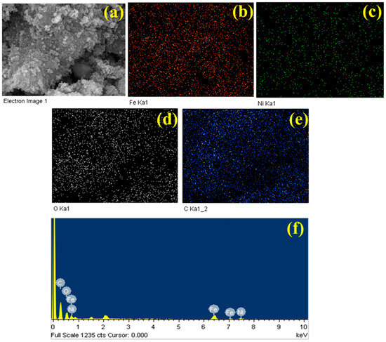EDS mapping analysis of Fe2O3-Ni-MCC. (a) Micrograph image, elements of (b) Fe, (c) Ni, (d) O, (e) C, and (f) EDS spectra results.