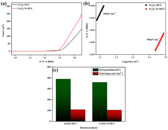 To assess the electrochemical efficacy of the electrocatalyst materials on MCC, their OER performance was evaluated under alkaline conditions in 1 M KOH solution. The catalytic activities of Fe2O3–MCC and Fe2O3–Ni–MCC were assessed by depositing them on the surface of the electrocatalyst support without using other supplementary binder materials. Linear sweep voltammetry (LSV) was used to evaluate the effectiveness of the electrode materials for the OER. In the LSV study, the working electrode consisted of the active materials coated on Ni foam together with MCC. The counter electrode was a Pt plate, and the reference electrode was Hg/HgO. The LSV measurements were conducted at a scan rate of 5 mV s−1. The OER polarization curves of Fe2O3–MCC and Fe2O3–Ni–MCC are shown in Figure 5a. Electrocatalysts incorporating MCC demonstrated notable electrocatalytic activity. These results clearly demonstrate that the use of MCC is beneficial for the cohesive binding of electrocatalyst materials and their successful attachment to the substrate surface. Thus, MCC plays a crucial role in anchoring the materials on the surface and promoting their interaction during electrochemical processes. Furthermore, the electrocatalyst materials remained adhered to the substrate surface during the OER. Fe2O3–MCC exhibited notable OER performance, as evidenced by an overpotential of 396 mV at a current density of 10 mA cm−2. The incorporation of Ni into Fe2O3–MCC improved the electrochemical performance. As shown in Figure 5a, the Fe2O3–Ni–MCC catalyst achieved a current density of 10 mA cm−2 for the OER with an overpotential (η10) of 360 mV. Here, the interaction between Ni and Fe2O3 resulted in a synergistic effect, which is the most advantageous factor for reducing the overpotential in the OER. To understand the OER kinetics of the electrocatalyst materials, Tafel plots, derived from the OER polarization curve, were constructed. Figure 5b shows the Tafel plots of Fe2O3–MCC and Fe2O3–Ni–MCC. The Tafel slope of Fe2O3–Ni–MCC (105 mV dec−1) was lower than that of Fe2O3–MCC (109 mV dec−1). The lower Tafel slope and overpotential of Fe2O3–Ni–MCC (Figure 5c) implies that it exhibits better reaction kinetics than Fe2O3–MCC because it requires a lower activation energy for reaction completion. Ni-based materials exhibit a dynamic electronic structure that may significantly enhance intermediate reactions during the OER, specifically, the conversion of OH* to OOH*. The OER performance of Fe2O3–Ni–MCC is comparable to those reported in other studies [11,12,13,14,51,59,60,61,62,63,64].