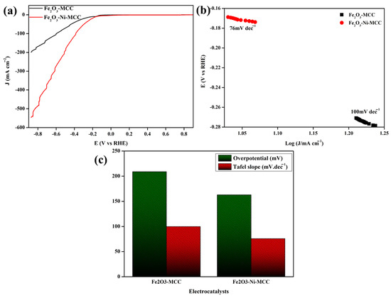 Electrochemical characterizations of HER performances: (a) LSV curves at 5 mV/s scan rate, (b) corresponding Tafel slopes, (c) comparison of Fe2O3-MCC and Fe2O3-Ni-MCC OER performance concerning overpotential at 10 mA cm−2 and Tafel slope.
