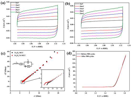 CV analysis of (a) Fe2O3-MCC and (b) Fe2O3-Ni-MCC at different scan rates; (c) EIS analysis results of Fe2O3-MCC and Fe2O3-Ni-MCC; (d) LSV; (OER) performances of Fe2O3-Ni-MCC before and after 500 CV cycles.