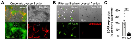 Characterization of capillary ECs from EC-EGFR-KO mice. (A,B): Bright field and fluorescent images of isolated microvessels from EC/SMC dual-reporter mice before (A) and after two-step filter purification (B). Green fluorescent protein expresses in ECs under the cadherin-5 (cdh5) promotor, and red fluorescent protein expresses in SMC/pericytes under the acta2 promoter. The vast majority (>98%, counted by cell numbers after DAPI staining) of tissue obtained by two-step filter purification was green fluorescence-positive and red fluorescence-negative microvessels, demonstrating that the collected tissue samples were capillaries. White arrows indicate microvessels in filter-purified microvessel fraction (panel B). In contrast, the crude microvessel fraction (before the two-step filter-purification) contains red fluorescence-positive microvessels (i.e., arterioles). Note: The green fluorescent image of crude microvessel fraction also shows auto-fluorescence in elastic lamina membranes and brain tissue debris. An example of green fluorescence-positive and red fluorescence-negative microvessels (i.e., capillaries) in crude microvessel fractions are circled by white dotted lines. Experiments were repeated four times and exhibited consistent and similar results. (C): EGFR protein in freshly isolated capillaries, pooled from 4 animals for each sample, were quantified by ELISA. EGFR protein was dramatically decreased in EC-EGFR-KO mice compared to WT animals (i.e., Cre-negative littermates). Data are presented as mean ± SEM (n = 8 samples from 32 WT animals, n = 6 samples from 24 KO mice). *** p < 0.001 between groups by unpaired t-test.