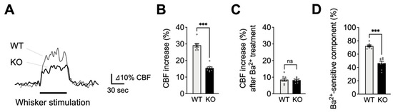 We next assessed functional hyperemia in EC-EGFR-KO and WT mice using laser Doppler flowmetry. As shown in Figure 2A,B, contralateral whisker stimulation caused a 29.2% ± 1.1% increase in CBF in WT animals (n = 8); by comparison, the same stimulation caused a significantly attenuated (~50%) hyperemic response (15.4 ± 0.7% increase) in EC-EGFR-KO mice (n = 8). To evaluate the contribution of Kir2.1 channel-mediated signaling, we topically applied the selective Kir2.1 channel blocker, Ba2+ (100 μM), to the superfusate flowing over the somatosensory cortex [8,15,34]. Consistent with the previously established involvement of Kir2.1 channels in the functional hyperemic response to whisker stimulation [8,15,34], this treatment substantially decreased functional hyperemia in both EC-EGFR-KO and WT mice, leaving the same residual response in both genotypes (Figure 2C). However, the Kir2.1-mediated (i.e., Ba2+-sensitive) component of this reduction was greater in WT mice (70.9% ± 2.5% reduction; n = 8) than in EC-EGFR-KO mice (46.8% ± 2.9% reduction; n = 8) (Figure 2D), suggesting that EC-specific EGFR ablation eliminated much of the Kir2.1-dependent response. Collectively, these observations indicate that ablation of EC-EGFR impairs Kir2.1-mediated capillary-to-arteriole vasodilatory signaling.