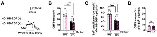 HB-EGF, an EGFR ligand, failed to restore functional hyperemia in EC-EGFR-KO mice. (A): Whisker stimulation-induced functional hyperemia before and after HB-EGF treatment in EC-EGFR-KO mice. (B): Summary data showing that HB-EGF treatment did not alter whisker stimulation-induced functional hyperemia in either EC-EGFR-KO or WT mice. (C): Ba2+-sensitive component of functional hyperemia before and after HB-EGF treatment. (D): Whisker stimulation-induced CBF increase after Ba2+ treatment. Ba2+ was subsequently and concurrently applied for 20 min by adding to HB-EGF-containing cortical superfusate. Data are presented as mean ± SEM (n = 4 animals in WT, n = 4 animals in KO). *** p < 0.001, ns: not significant between groups by two-way ANOVA (B,C) or by unpaired t-test (C).