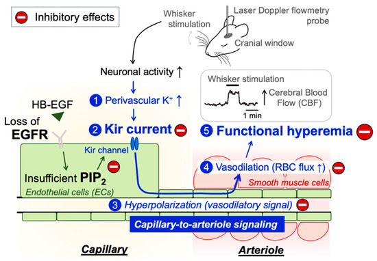 Schematic illustration of the proposed signaling pathway underlying functional hyperemia deficits in EC-EGFR-KO mice. Whisker stimulation and subsequent neuronal activation, which increases perivascular K+ during neuronal repolarization, results in Kir2.1 channel activation in capillary ECs. Kir2.1 channel-initiated hyperpolarizing vasodilatory signal rapidly propagates upstream and dilates the precapillary arteriole, increasing downstream tissue perfusion. This local increase in blood flow in neuronally active regions of the brain is termed functional hyperemia, which is detected using laser Doppler flowmetry in this study. Genetic deletion of EGFR disrupts functional hyperemia in response to whisker stimulation by causing Kir2.1 channel dysfunction, which is likely attributed to lowering the level of PIP2, an essential co-factor of Kir2.1 channels.