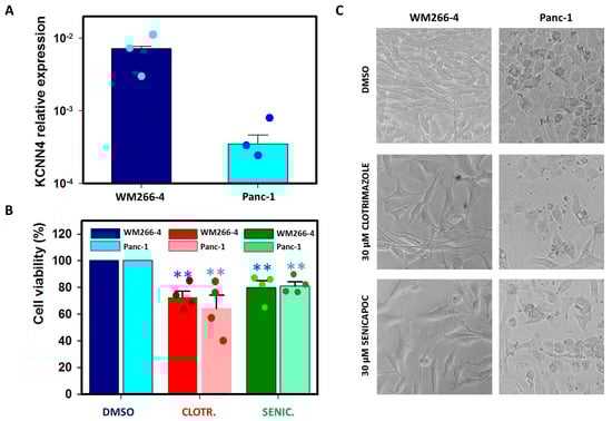 IK blockers affect WM266−4 and Panc−1 viability regardless of IK channel expression. (A) Relative KCNN4 expression from RT-qPCR showing the difference in KCNN4 mRNA levels between WM266-4 and Panc-1 (N = 3). (B) Results from MTT viability assays after 72 h of exposure to 30 µM clotrimazole, 30 µM senicapoc or the corresponding amount of DMSO (N = 4 for all). Data are reported as absorbance (570 nm) ratio drug-/DMSO-treated cells (color code reported in the legend). (C) Exemplary pictures from experiments in (B): WM266-4 and Panc-1 cells treated for 72 h with 30 µM clotrimazole, 30 µM senicapoc or the corresponding amount of DMSO. Significance level is indicated by two asterisks (p < 0.01).