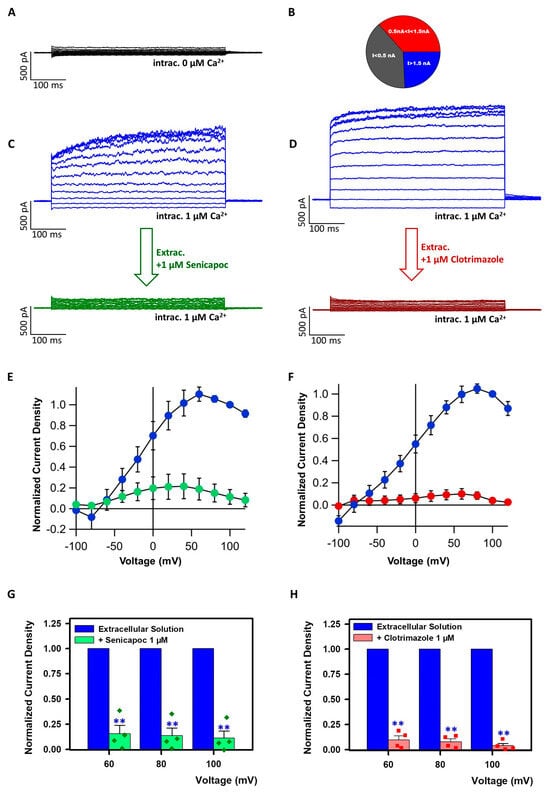 As previously mentioned, we observed a relatively large variability in the amplitude of the Ca2+-dependent currents, while the currents recorded in the absence of intracellular Ca2+ were small and more comparable among different cells. For this reason, the apparent degree of block is also variable between different cells, as background conductances influence the results more strongly in cells that express less IK current. To obtain a more accurate quantification of the inhibitory effect, we subtracted background currents from the currents recorded in the presence/absence of the blockers. Both senicapoc and clotrimazole strongly reduced the currents induced by 1 µM Ca2+. The features and the pharmacology of the above-described currents strongly suggested that they were carried by IK channels.