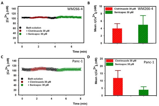 We have previously reported that K+ channel modulators can alter the intracellular calcium concentration ([Ca2+]i) of cancer cells []. It was also observed by other authors that the IK channel can regulate calcium entry: in prostate cancer cells, its activation induces calcium uptake through TRP channels by increasing the driving force for calcium []. To check if our results could be explained by [Ca2+]i alterations, we performed Ca2+-imaging experiments on Panc-1 and WM266-4 cells testing whether clotrimazole or senicapoc can have some effects on [Ca2+]i. [Ca2+]i was monitored over time with the fura-2 fluorescent probe before and after the application of 30 µM clotrimazole or 30 µM senicapoc. In Figure 5A,C the mean [Ca2+]i values from these experiments are reported. Neither WM266-4 cells nor Panc-1 showed a significant variation of [Ca2+]i after the application of the two molecules; rather, there were only small fluctuations that were never larger than 15 nM. The average Δ[Ca2+]i values (with respect to the standard bath solution) after the perfusion of clotrimazole and senicapoc on WM266-4 cells were only 4 ± 1.3 nM and 5 ± 2.5 nM, respectively (Figure 5B, N = 32 cells). Such small variations in [Ca2+]i were observed also for Panc-1: Δ[Ca2+]i values were 12 ± 5 nM for clotrimazole and 5 ± 2 nM for senicapoc (Figure 5D, N = 32 cells). The lack of significant variations in [Ca2+]i caused by the two compounds indicated that they induced neither the activation of a Ca2+ membrane conductance nor the release of Ca2+ from intracellular stores.