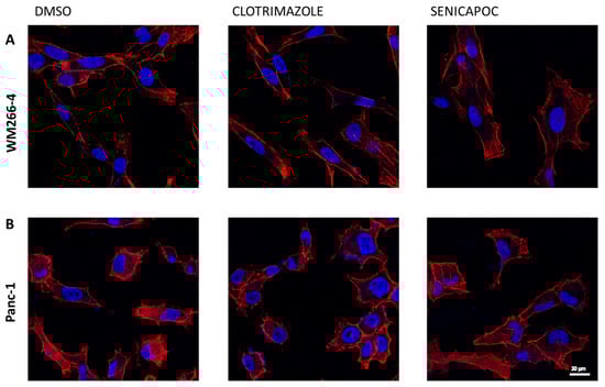 Another hypothesis we formulated to explain our unexpected results was that IK blocker treatments could affect cellular cytoskeleton organization. This idea emerged since the invasive migration of WM266-4 and Panc-1 was altered by the exposure to the tested molecules. Thus, in order to evaluate the effect of clotrimazole and senicapoc on Panc-1 and WM266-4 actin organization, we utilized phalloidin staining, which was able to bind the filamentous actin (F-actin). Phalloidin staining did not appear to modify both WM266-4 and Panc-1 cells after 24 h of treatment (Figure 6). However, changes in the F-actin organization could be detected after 72 h of treatment with 30 µM of clotrimazole or senicapoc (Supplementary Figure S2). These observations suggested that exposure to clotrimazole or senicapoc did not significantly alter the F-actin organization of Panc-1 and WM266-4 cells after 24 h.