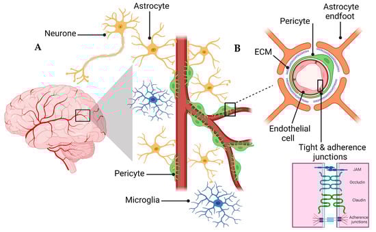 A schematic presentation of the NVU and the BBB are shown in Figure 1. The NVU is a crucial anatomical and functional unit that safeguards the homeostasis and optimal functioning of the central nervous system (CNS) [24]. Comprising several cell types, the NVU forms an interactive and dynamic system with its cellular constituents (Figure 1A). Neurons, the principal functional entities orchestrating signal transmission throughout the nervous system, are essential for the NVU [25]. Their close interaction with astrocytes, star-shaped glial cells, is pivotal for maintaining extracellular ion balance, facilitating synaptic transmission, and regulating CBF [26]. Microglia, the CNS’s resident immune cells, continually patrol the neural milieu and are ready to respond to alterations or threats [27]. Microglia participate in inflammatory responses and contribute to the NVU’s overall functionality by interacting with other cellular entities, including neurons and astrocytes [28].