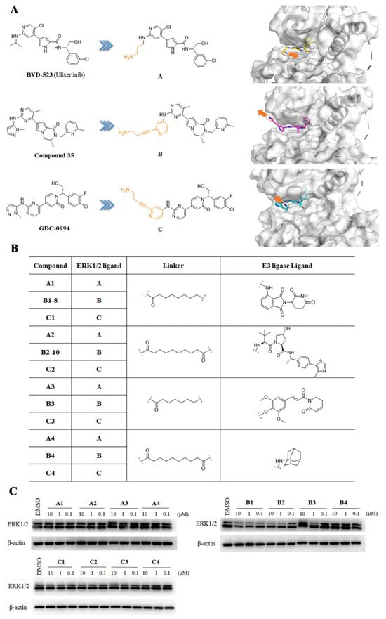 Design of the inhibitor-based ERK1/2 PROTACs. (A) Docking model of the modified inhibitors of ERK1/2 (PDB: 6GDQ). (B) Structures of ERK1/2 PROTACs. (C) A375 cells were treated with DMSO and compounds for 12 h at the indicated concentrations, followed by Western blot analysis.