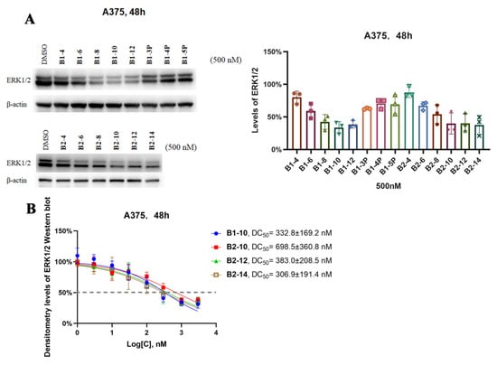 The compounds in Figure 2B were used to treat A375 cells at various concentrations. The Western blot analysis revealed that B1 and B2 induced downregulation of ERK1/2 protein in A375 cells, whereas other compounds did not (Figure 2C).
