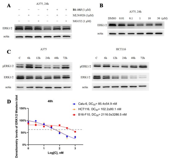 B1-10J was chosen as a representative compound for further characterization. It was first confirmed that B1-10J induced ERK1/2 degradation via the ubiquitination pathway. A375 cells were treated with or without B1-10J, proteasome inhibitor MG132, and E3 ligase inhibitor MLN4924 for 24 h [27,28]. The Western blot results indicated that ERK1/2 protein was only degraded by B1-10J alone (Figure 4A). In addition, A375 cells treated with B1-10J at a large range of concentrations exhibited a typical “hook” effect (Figure 4B) [29]. These findings verified that B1-10J induced ERK1/2 degradation through the ubiquitination pathway. Moreover, experiments were conducted to demonstrate the time-dependent degradation of ERK1/2 proteins. After A375 and HCT116 cell lines were treated with 1 μM B1-10J, ERK1/2 protein began to degrade at 6 h and nearly reached its highest level at 24 h. The degradation of ERK1/2 in HCT116 cells lasted up to 72 h, whereas in A375 cells, the protein level returned to normal after 48 h. Phosphorylated ERK1/2 plays a significant physiological role, and its variations were also monitored [4,30]. Interestingly, pERK1/2 exhibited an upward trend during the initial phase of the degrader treatment. pERK1/2 began to decrease as ERK1/2 was progressively degraded, but after 72 h, pERK1/2 returned to a high level (Figure 4C). To evaluate the ERK1/2 degradative activity of B1-10J in cancer cells, Calu-6, HCT116, and B16-F10 cancer cell lines were treated with different concentrations of B1-10J for 48 h, and the expression of ERK1/2 protein was quantified using Western blotting with grayscale quantification. The results demonstrated that B1-10J showed good degradative activity on HCT116 and Calu-6, with DC50 values of 102 nM and 85 nM, respectively, and weak degradative activity on B16-F10 murine melanoma cells (Figure 4D and Figure S2).