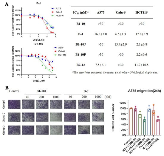 As mentioned previously, ERK1/2 is closely associated with the formation of tumors. In numerous human cancer cells, the ERK1/2 pathway is abnormally activated. Initially, the growth-inhibiting effects of B1-10J on three cancer cell lines were assessed, as reported in previous studies of ERK1/2 inhibitors [14,15,25,31]. A375, HCT116, and Calu-6 cells were treated with indicated concentrations of B1-10J for 72 h. These cancer cells displayed variable degrees of growth inhibition, with IC50 values of 2.1 μM for HCT116, 15.9 μM for Calu-6, and >30 μM for A375. The insensitivity of A375 cells was attributed to the lower ERK1/2 degradation ability in A375 cells, compared with that of HCT116. In addition, the growth-inhibiting effects of B1-10J, B1-10, B1-10P, B2-12, and the “warhead” part (B-J, Scheme 3) of B1-10J were evaluated in these cells (Figure 5A). Because the A375 cell line was less susceptible to the growth inhibition of B1-10J, it was selected to observe the effect on cell migration in a Transwell chamber. As shown in Figure 5B, A375 cell migration decreased markedly after 24 h. Using 33% acetic acid to wash crystal violet to measure the absorbance, it was found that the migration rate decreased by more than 50%. This result suggested that ERK1/2 degradation inhibited the migration of A375 cells.