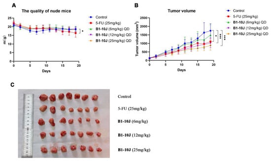 The antitumor activity of B1-10J in an HCT116 subcutaneous xenograft model. (A) The weight fluctuations of nude mice. (B) The plots show the average tumor volumes of HCT116 over time upon intraperitoneal injections of B1-10J at 6, 12, or 25 mg/kg Q.D. Average volumes are geomeans, and error bars show ± SD. * p < 0.05 and *** p < 0.001. (C) Photographs of nude mice and HCT116 tumors.
