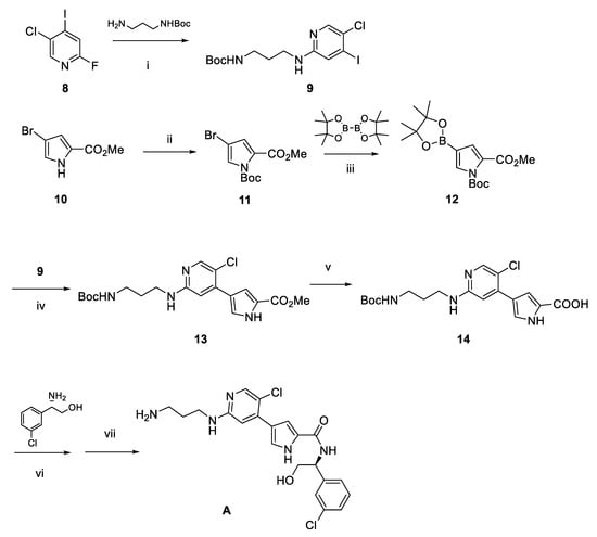 The synthesis of compound A is described in Scheme 2. The substitution reaction of compound 8 with tert-butyl (3-aminopropyl)carbamate produced compound 9. Compound 12 was prepared according to previous protocols [25]. Compounds 9 and 12 were submitted to Suzuki–Miyaura cross-coupling reaction, followed by hydrolysis, to generate compound 14. Coupling compound 14 and (S)-2-amino-2-(3-chlorophenyl)ethan-1-ol using HATU in dimethylformamide (DMF) and removing the t-butyloxy carbonyl (Boc) groups with trifluoroacetic acid (TFA) afforded compound A.