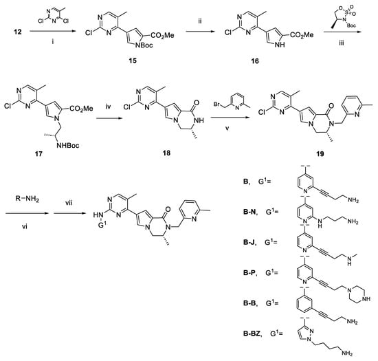The reagents and conditions were as follows: (i) Pd(PPh3)4, K3PO4, dioxane, H2O, 90 °C, 8 h; (ii) TFA, DCM, r.t., 2 h; (iii) K2CO3, 18-crown-6, dioxane, 100 °C, 12 h; (iv) a. TFA, DCM, r.t., 2 h; b. NH4OH, MeOH, 50 °C, 2 h; (v) NaH, DMF, r.t., 4 h; (vi) BrettPhos Pd G3, Cs2CO3, t-BuOH, dioxane, 85 °C, 6 h; and (vii) TFA, DCM, r.t., 2 h.