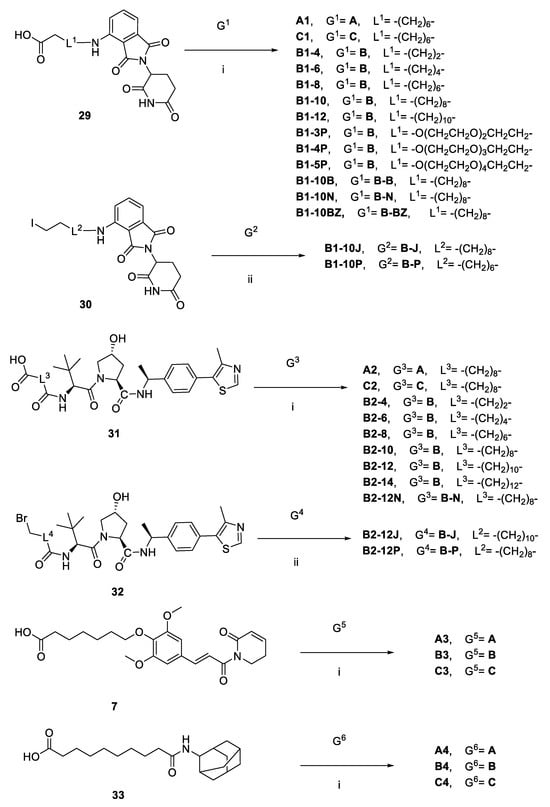 The synthesis of PROTAC compounds is described in Scheme 5. The substitution of iodide 30 and bromide 32, or the formation of amides via HATU-mediated condensation reactions of acids (7, 29, 31, and 33) with corresponding amines, was carried out to afford PROTAC compounds, respectively.