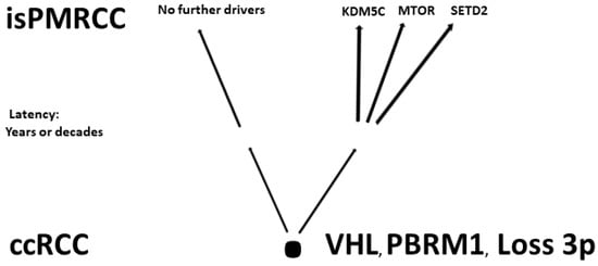 - Based on the improved prognosis of multiorgan metastases of ccRCC with concurrent PM compared to cases without PM, as shown by Grassi [], and since repeatedly confirmed [,,,,,,,], Singla and colleagues in 2020 focused on the question of genetic characteristics of PM in mRCC []. (Their study group included 31 patients, but only a subgroup of just 10 (32%) met the isPMRCC criteria. However, the larger group (68%) experienced PM with simultaneous extrapancreatic multiorgan metastases of the ccRCC, which needs to be considered when assessing the relevance of the results for the specific isPMRCC topic discussed here because the detailed differences in metastasis behaviour between the two groups (single organ vs. multi-organ metastases) and the very special clinic of the isPMRCC (9.5 years metastasis-free interval until occurrence of PM and 75% 5-year survival rate, Section 1) make some genetic/epigenetic differences at least possible). In their extensive, meritorious study, Singla and colleagues were able to document genetic changes associated with less aggressive disease pathways: a low frequency of copy number variants associated with aggressiveness, such as 9p, 14q and 4q loss [,,]. Furthermore, the authors found a low rate of PAB1 (3%) and a high rate of PBRM1 defects (77%)—changes associated with a less aggressive disease course [,]. Similarly, no driver mutation could be detected in TERT, which is associated with an aggressive disease course in RCC []. In contrast, KDM5C—after VHL and PBRM1—was the third most common gene mutation in the studied material with a frequency of 24%. As already pointed out above (Section 2.1), the concurrent occurrence of PBRM1 and KDM5C mutations is again a sign of a favourable course []. The high frequency of KDM5C mutations differs from metastatic ccRCC without PM in two respects. On the one hand, the value of 24% is the highest reported frequency so far [,,,]. On the other hand, in non-isPMRCC studies, KDM5C was only the fifth most common mutation [,,,,,]. As a further important characteristic of PMRCC, these authors also stress the unusual genetic stability of tumour cells, as limited diversification was observed both in the primary tumours leading to PM and in the subsequent PM themselves. The authors concluded that tumours and metastases from patients with PM are consistent with a constrained evolutionary process.