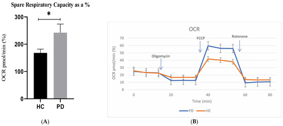 - Smith, A.; Depp, C.; Ryan, J.; Johnston, I.; Alegre-Abarrategui, J.; Evetts, S.; Rolinski, M.; Baig, F.; Ruffmann, C.; Simon, K.; et al. Mitochondrial dysfunction and increased glycolysis in prodromal and early Parkinson’s blood cells. Mov. Disord. 2018, 33, 1580–1590. [Google Scholar] [CrossRef] [PubMed]