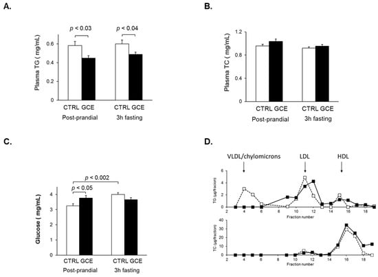 Plasma TG levels were measured both at the end of the dark cycle (between 8:00 and 9:00 AM), considered as the post-prandial period, as well as at noon after a 3 h fasting period []. For both time points, plasma TG levels were significantly lower in the GCE group (Figure 3A), consistent with previous reports showing a hypotriglyceridemic effect of GCE [,,]. No significant difference was observed in plasma TC between the two groups (Figure 3B). Furthermore, analysis of lipoprotein profiles obtained from a pool of plasma from three animals from each group revealed the absence of a peak corresponding to TG-rich lipoproteins (VLDL and chylomicrons) in GCE-treated mice (Figure 3D), which would be consistent with the observed lower levels of plasma TG. Plasma glucose levels were relatively high in both groups and significantly different between the GCE and CTRL groups, but only in plasma obtained at 9:00 AM (Figure 3C). However, plasma insulin (CTRL 0.34 ± 0.019 ng/mL; GCE 0.36 ± 0.020 ng/mL) was not significantly different between the two groups, suggesting an absence of glucose intolerance or insulin resistance. Plasma leptin, which also participates in regulating peripheral insulin sensitivity, was not found to be significantly different in either group (CTRL 0.27 ± 0.059 ng/mL; GCE 0.36 ± 0.058 ng/mL) [].