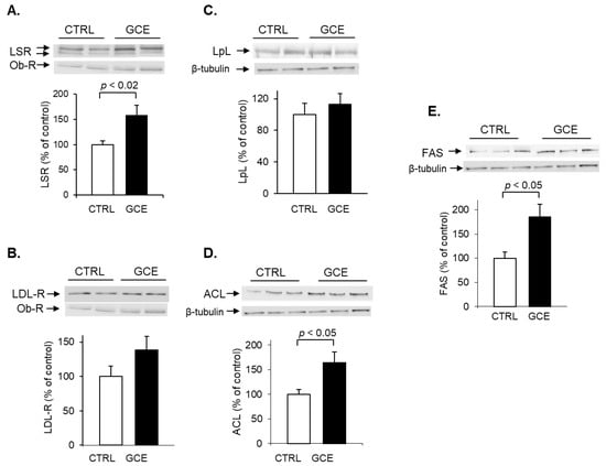 Internalization of TG-rich lipoproteins with LSR requires the presence of fatty acids to activate LSR. Fatty acids are lipolytic products produced following the hydrolysis of lipoprotein TG via lipoprotein lipase (LPL), which is bound to the endothelial cell walls in the space of Disse [,]. Immunoblots were therefore also performed to detect hepatic LpL; protein levels were not found to be different in the GCE group as compared to CTRL (Figure 4C).