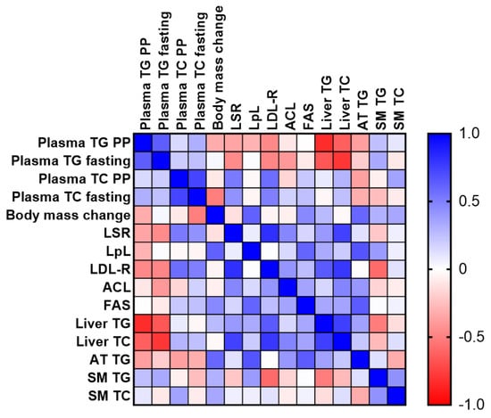 Correlational analysis was then performed on the combined data of the CTRL and GCE groups. A heat matrix plot revealed that liver TC and TG were strongly and inversely correlated with both plasma and post-prandial TG levels; this was not the case for adipose tissue or muscle lipid levels (Figure 5, Table S1). Liver TC was strongly correlated with both LSR and LDL-R, while liver TG was correlated with only LDL-R. Correlational analysis also revealed a strong association between hepatic LSR and LDL-R protein levels.