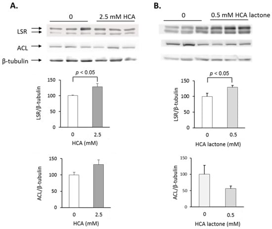 Effect of HCA or the lactone form of HCA (HCA-lactone) on LSR and ACL protein levels in Hepa1-6 cells. Hepa1-6 cells at 80–90% confluency were incubated with the indicated concentrations of (A) HCA or (B) HCA-lactone for 18 h at 37 °C, followed by cell lysis to extract total proteins. Immunoblots were performed on the cell protein extracts to detect LSR or ACL, as described in Methods and Materials. Densitometric analyses were performed using β-tubulin as the loading control. Results are shown as means ± SEM (n = 3). Statistical analyses were performed using Student’s t-test; p values are shown in the figure.