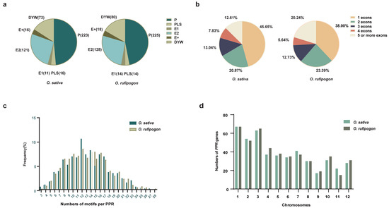 The analysis of species-specific PPR genes showed that O. sativa possessed approximately 70 PPR genes, while O. rufipogon had 89 (Figure 4b). Statistical analysis was performed on the exons of shared and unique PPR genes in the two species. We observed that the largest proportion among the 390 shared genes was the 180 genes with only one exon. Among the 70 unique PPR genes in O. sativa, the highest proportion of 30 genes contained one exon. Interestingly, out of 89 unique PPR genes, 34 had 5 exons with the highest proportion in O. rufipogon, surpassing the number of 25 genes with only 1 exon (Figure S1b).